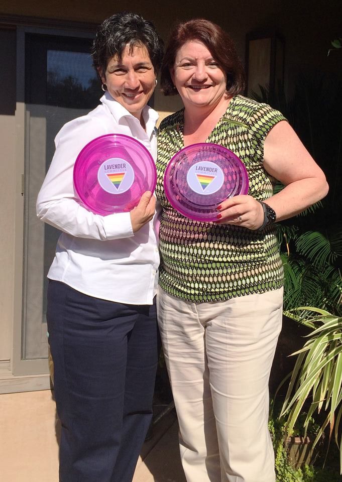 Frisbees are the SEIU Local 1000, Lavender Committee items that they had ordered for participation in the upcoming 2015 Pride Festivals. They were given to the host, Former State Senator, Patrick Johnston, Speaker of the Assembly, Toni Atkins and Asm. Susan Eggman (AD-13).